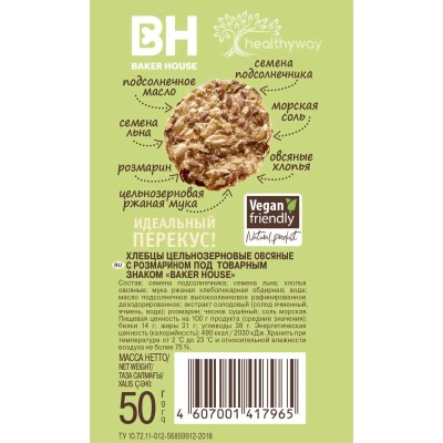 Хлебцы цельнозерновые Baker House овсяные с розмарином, 50г