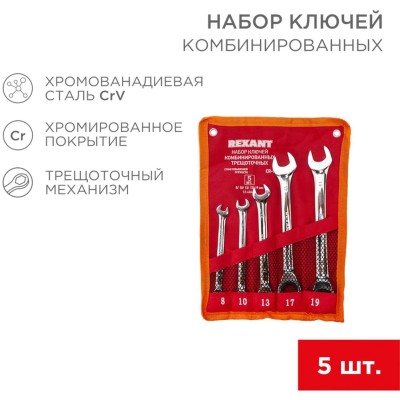 Набор ключей комбинир. трещ. 5шт.(8-19мм) CrV, зерк. хром. REXANT 12-4841-1