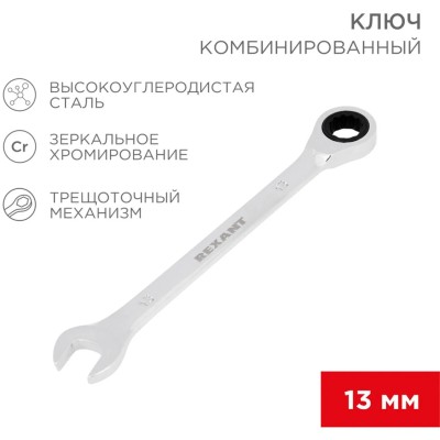 Ключ комбинированный трещоточный 13мм, CrV, зеркальн. хром REXANT 12-5808-1