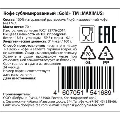 Кофе сублимированный Maximus Gold в стеклянной кружке 70г
