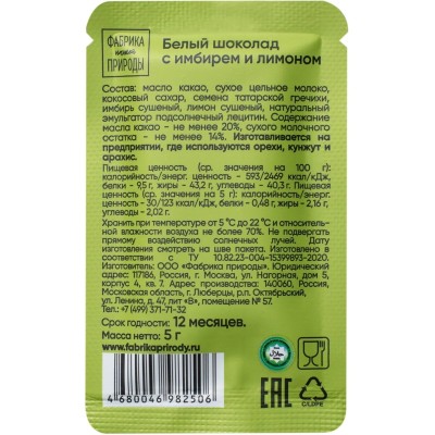 Шоколад Фабрика нашей природы белый с имбирем и лимоном, 20гx6шт/уп