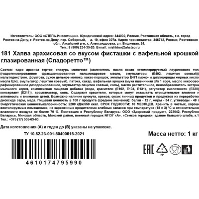 Конфеты Сладоретто халва арахис со вкус фисташ с ваф крошк глазир, 1кг