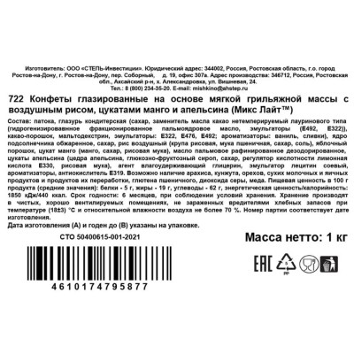 Конфеты Микс Лайт грильяж мягкий с возд.рис, цук манго и апельс глазир, 1кг